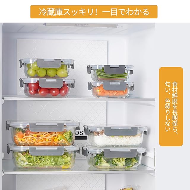 【高品質素材】高品質高ホウケイ酸ガラス素材を使って、高強度、高透明度、高い安定性を誇り、衝撃に強く、傷が付きにくいため、酸性度が高い料理や塩分の多い料理の保存に適しています。食品保存容器本体は透明なので、冷蔵庫の中の食材が一瞬で確認できます。