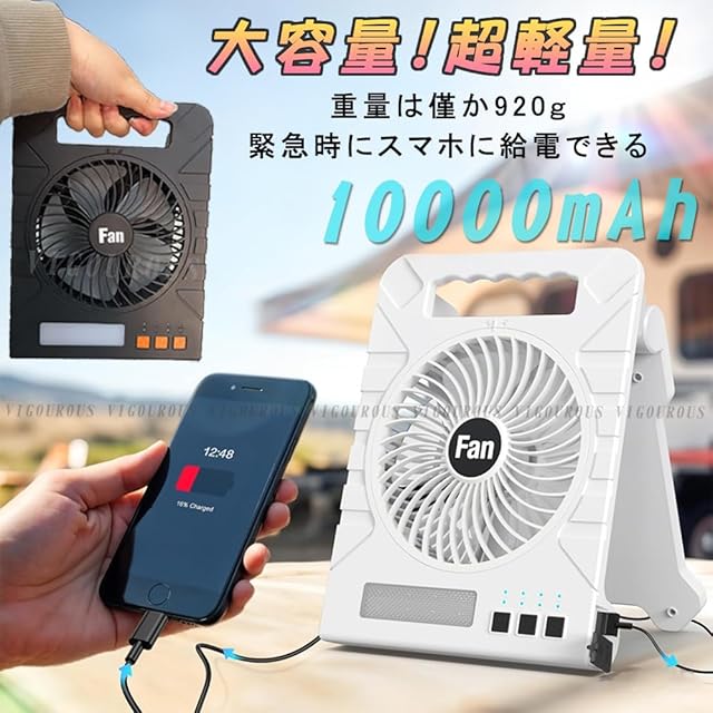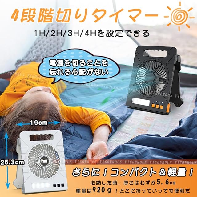 2025年VIGOUROUS新登場の扇風機は室外でソーラー充電だけではなく、室内でUSB充電(TYPE-C)もできます。950g超軽量で携帯することがとても便利です。また、3段階の調光モード&懐中電灯機能、4段階風量調節、4段階切りタイマー機能も付きますので、週末や休日などのアウトドアには、さまざまなシーンで活躍します。