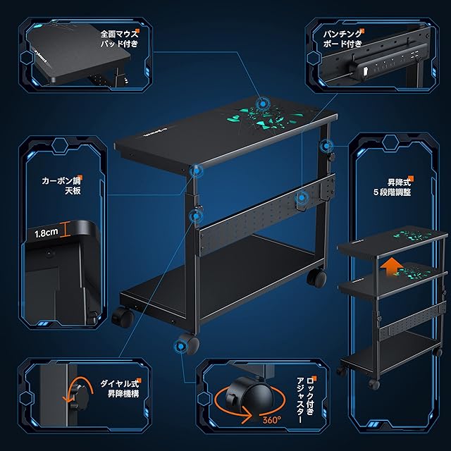 【既存品を改良して新機能を追求】 ダイヤル式高さ調整機構や、取付式パンチングボードなど、使いやすい機能を追求しました。カーボン調天板については厚みを従来比で2割増しにしています。全面を覆うマウスパッドは、高級感にあふれていて贅沢な雰囲気です。高品質キャスター(ロック付き)も搭載されているので、自由な場所に移動・固定して利用できるのも便利です。