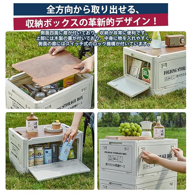 製品特徴:1. 全方向から取り出せる設計: 私たちの収納ボックスは、どの方向からでも簡単に取り出せる革命的な設計です。使用しない時は折りたたみ、余計なスペースを占めません。側面四面に扉が付いており、収納が非常に便利です。上部にはふたが付いており、物入れが容易で、蓋をロックすることもできます。ボックスを積み重ねた状態でも、侧面扉から簡単に物を取り出せるため、従来の収納ボックスよりも便利で機能性が向上しています。2. 実用的な木製蓋: 厚みのある木目調の天板は自由に取り外しでき、テーブルや椅子としても使用できます。キャンプなどのアウトドアでも便利です。収納箱の両端には凹みがあり、満杯でも簡単に運べて、持ち運びが楽です。洗練されたデザインで、コンパクトかつ運びやすい安定した構造で、滑りにくい耐摩耗性のある滑らかな表面です。無臭で安心して使用できます。3. 組立簡単で省スペース: 私たちの折りたたみ式収納ボックスは組立が簡単で、使用時は十分な大容量を提供し、使用しない時はコンパクトに折りたたみ、高さはわずか約78cmで、少しの隙間に置いておくことができます。車のトランク用収納箱としても最適です。トランク内の雑然とした空間を効果的に整理でき、使用しない時は簡単に折りたたみ、収納できるので、スペースを節約して便利です。4. 積み重ね可能&収納スペースにもなる: 安全性と滑りにくさを考慮し、複数段の積み重ねが可能です。重ねて使用しても、横から簡単に取り出せる設計で便利です。天板は質感のある木板で、小物の収納やキッチンの食器収納、書類整理、ベッドサイドテーブルとしておしゃれで実用的です。5. 室内外兼用&多機能: 本製品は複数のサイズを用意しており、キャンプなどのアウトドアシーンでも大活躍します。家庭ではベッド下収納、リビングの整理、車のトランク収納などに役立ち、防災グッズの保管にも適しています。商品サイズと色展開:私たちは3つの異なる容量の折りたたみ式収納ボックスを提供し、それぞれ25L(37.2cm x 26.3cm x 21cm)、35L(44.5cm x 31.5cm x 25cm)、55L(50.6cm x 36cm x 29cm)で、折りたたみ後の厚さはそれぞれ8.5cm、7.5cm、7.8cmです。これらの収納ボックスはスペースを節約し、持ち運びや保管が簡単です。また、ブラック、グリーン、ホワイトの3つの色展開で、お客様の個性やインテリアスタイルにマッチする選択肢を提供しています。私たちの折りたたみ式収納ボックスを選んで、生活をより整然と便利にしましょう。今すぐ購入して、空間最適化の魔法を体験してください!