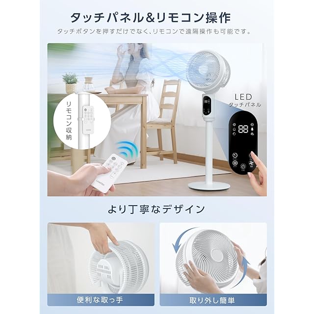 【タッチパネル&リモコン操作・1.7mコード】タッチセンサー式の操作パネルは、手動で風量やモードを簡単に調節できます。リモコンも付属しており、遠隔操作も可能。延長した1.7mの電源コード、従来のリビング用扇風機より、設置場所の距離制限を気にせずに、より快適で便利な生活をお楽しみいただけます。