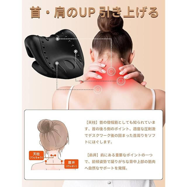 【プロ仕様24圧点】首から肩甲骨まで24ヶ所の立体指圧ポイントを配置。U字サポート部の立体的な設計が、スマホ使用で凝り固まった首周りの筋肉にソフトにアプローチ。横になった際の自然な重量配分で、無理なくコリ部位に圧を分散します。