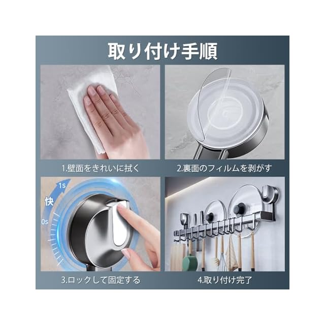 【繰り返し使用可能な強力吸盤】キッチンツールフックは水洗いすることで何度でも再使用が可能な超強力真空吸盤を採用します。取り付ける際に壁に穴を開ける必要がなく、取り外しも簡単なため、賃貸住宅にも最適です。また、強力な吸着力でキッチンツールをしっかりと固定します。耐荷重性に優れた設計で、重たい鍋やフライパンをしっかりと支えることができます。
