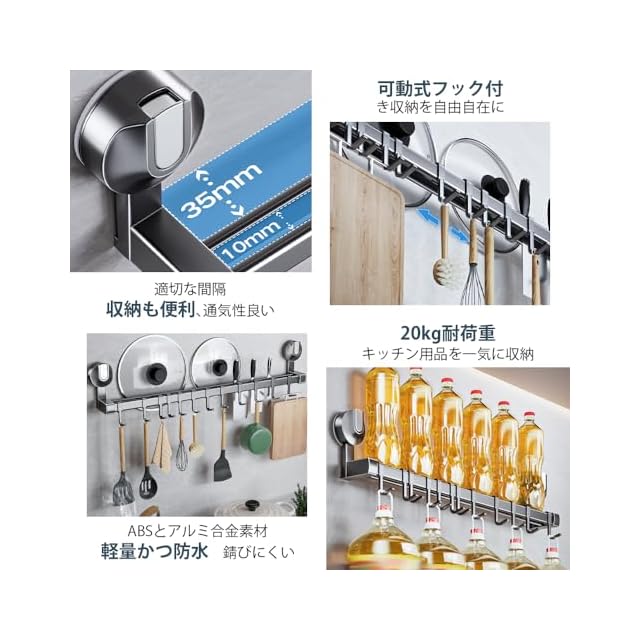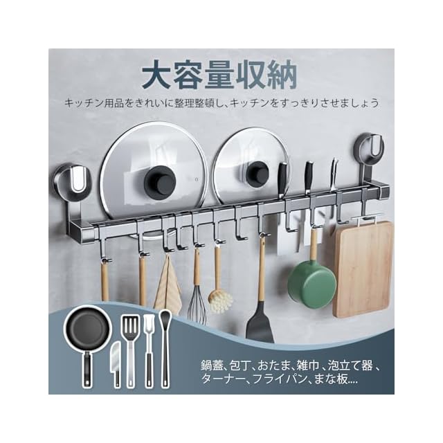 商品名:キッチンツールフック 吸盤 フック 強力 アルミニウム キッチンラック 防水防錆 キッチン収納 調理器具 鍋蓋置き キッチンツール 収納 壁掛け 可動式フック 壁 傷つけない 50cm 8個フック (グレー, 幅50cm)