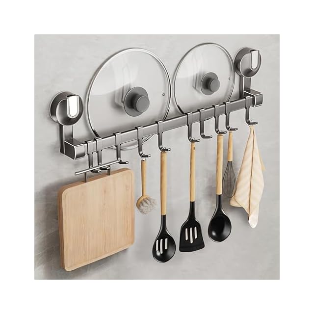 キッチンツールフック 吸盤 フック 強力 アルミニウム キッチンラック 防水防錆 キッチン収納 調理器具 鍋蓋置き キッチンツール 収納 壁掛け 可動式フック 壁 傷つけない 50cm 8個フック (グレー, 幅50cm)