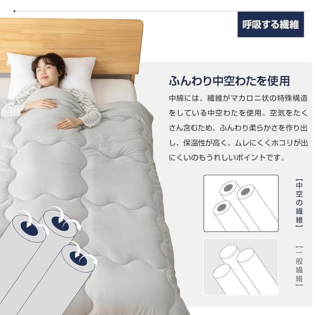 【中空構造のポリエステル綿·春夏秋かけふとん】中空ポリエステル中綿は、耐久性があるため、綿切れが少なく、ほこりも出にくい。放湿性が高く蒸れにくいのも特徴。ボリュームたっぷりで、羽毛布団に代われる保温性の高いかけ布団です。冬の場合暖かい空気を含む、保温力が高い。夏の場合、吸湿·発散性が高く、ムレにくく快適 。