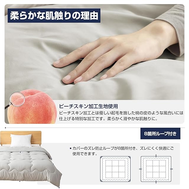 【ピーチスキン加工·合い掛け布団】桃のようなソフトタッチで、素肌に触れてもやわらかく心地いいです。静電気抑制(防止)加工で乾燥な季節でもご心配なく使用できます。なお、デリケートなお肌の方、お子様にも安心してお使いいただけます。