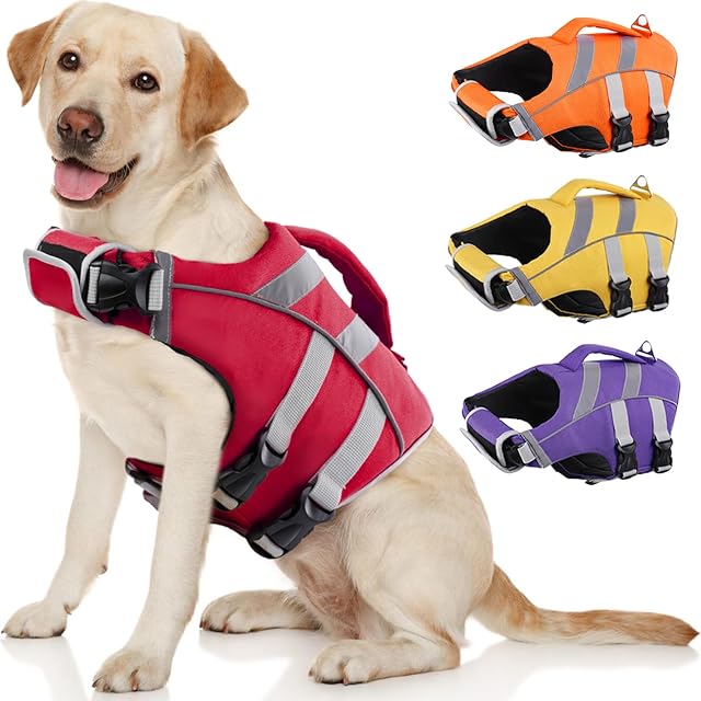 商品名:Kuoser犬用ライフジャケット 小型犬用 ライフセーバー 救命胴衣 高浮力素材 反射テープ 着脱簡単 防水 バックル締め マジックテープ 水泳 水遊び プール レッドS