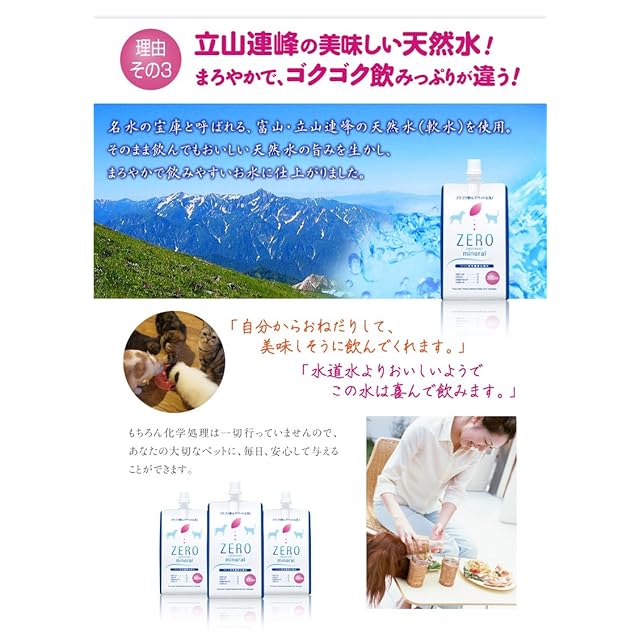 【ZEROミネラルが選ばれる3つの理由】</br></br><1>北アルプス天然水からナトリウム、カルシウム等のミネラルを除去。硬度0の軟水で作ったペット水素水です!</br>シニア期の猫や犬の水分補給において、ミネラルの過剰摂取には注意が必要です。このペット水素水はROフィルター(逆浸透膜)により不純物とミネラルを除去。少しでもいい飲み水を与えたいペットオーナーから選ばれています。</br></br><2>水素が長持ち!開封後3日後も約90%、加温してふやかしフードにも!</br>水素水は製造技術により水素の保持期限に差が出ます。このペット水素水は水を微小なミスト状にして水素をたっぷり結合させる加圧式製法のため、水素が長持ちします。また約60℃まで加温可能なので、飲み水だけでなくドライフードをふやかすお水に使われる方も。</br></br><3>北アルプスのおいしい地下天然水を使用、ゴクゴク飲みっぷりが違います!</br>名水の宝庫と呼ばれる、富山・立山連峰の地下天然水(軟水)を使用。そのまま飲んでもおいしい天然水の旨みを生かし、まろやかで飲みやすいお水に仕上がりました。もちろん化学処理は一切行っておりません。