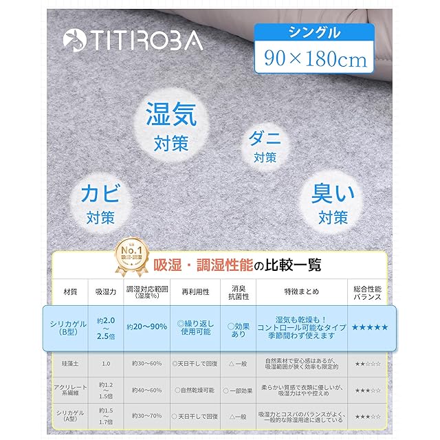 商品名:【吸湿・調湿NO.1の材質採用】チチロバ(TITIROBA) 除湿シート シングル 湿気対策 吸湿センサー付き 防ダニ 防カビ 消臭 除湿マット 寝具用除湿シート 布団湿気取りシート 吸湿マット ベッド用 洗える 梅雨対策 90×180cm グレー DJ0004