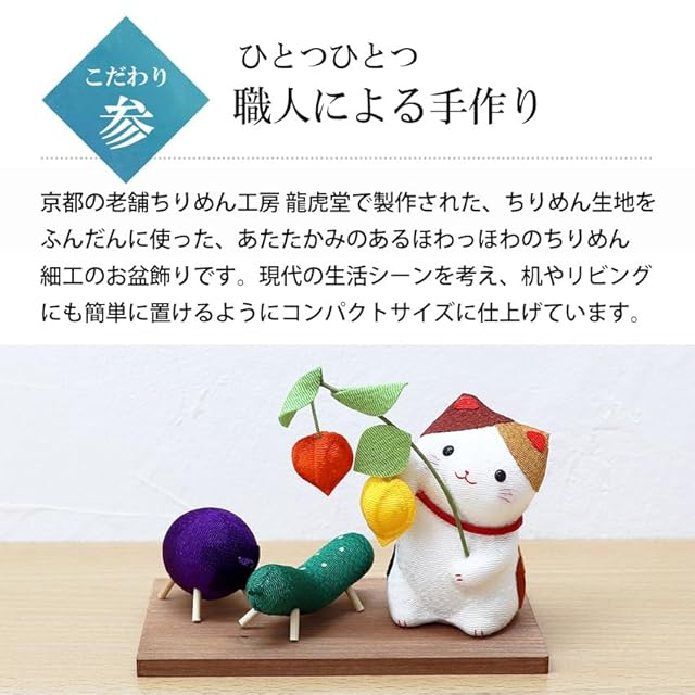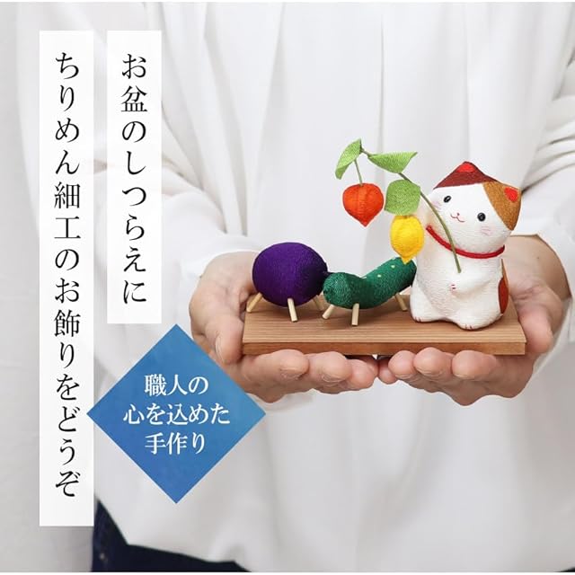 家族が集うお盆の季節にちりめん細工の温もりを添えて…。どこか”ぬくもり”を感じるちりめん生地。いつまでも可愛くお飾りできます。超コンパクトサイズで机にもリビングにも簡単にお飾りできます。やさしい風合いのお盆飾り。京都の職人が一つ一つ丁寧に手作業で作り上げています。京都の老舗ちりめん工房 龍虎堂で製作された、ちりめん生地をふんだんに使った、あたたかみのあるほわっほわのちりめん細工のお盆飾りです。<br>現代の生活シーンを考え、机やリビングにも簡単に置けるようにコンパクトサイズに仕上げています。当店だけのオリジナル、お線香の老舗 玉初堂の一番人気香樹林のお試しセット付
