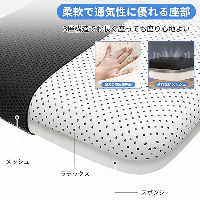 【ラテックス座部&通気性抜群のメッシュ生地】: クッションは高反発ラテックス製で、柔らかく弾力性があり、通気性と放熱性に優れています。心地よいクッション性があり、リラックス効果が抜群で、ソファのように包み込まれる快適な座り心地が体験できます。背もたれと座面には、通気性の良いメッシュ素材を採用しました。よりよい伸縮性がありメッシュは背中にやさしく、長時間の作業もサポートします。テレワーク用、勉強用、在宅ワーク用、様々な場合で活躍です。