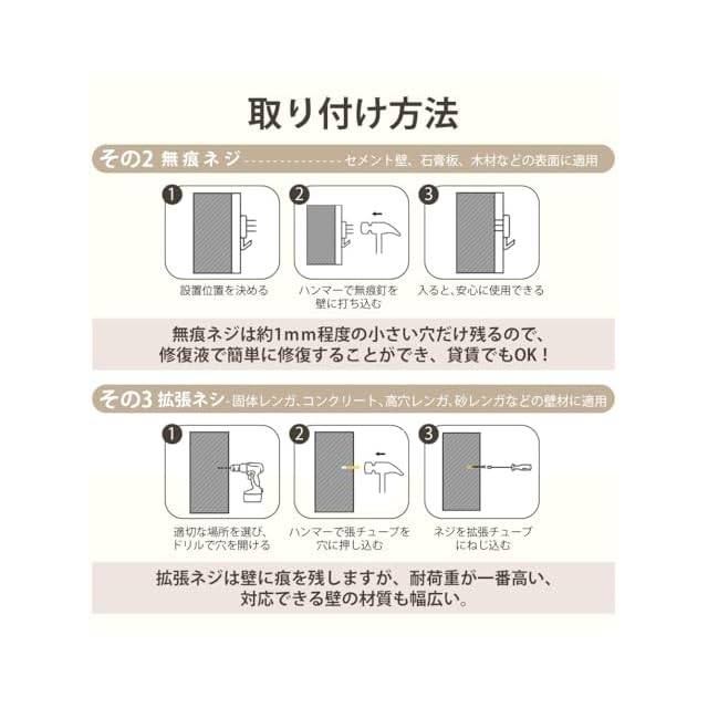 【壁を傷つけず簡単設置!選べる3つの取り付け方法】壁を傷つけることなく、簡単に取り付けられる3つの取り付け方法を備えたウォールシェルフです。粘着フック、無痕ネジ、拡張ネジの3種類の取り付け方法から選べるため、賃貸住宅や、壁に穴を開けたくない場所でも安心して設置が可能です。壁を傷つけず、しっかり固定できる点がオゥールシェルフの大きな魅力です。