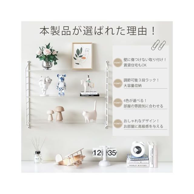【調整可能な棚板で、自由自在な収納アレンジ】ウォールシェルフは、収納するアイテムのサイズや用途に応じて、棚の高さを自由に調整することが可能です。ディスプレイシェルフ、本棚、バスルーム収納棚などとして、様々なシーンに活躍しています。個々のニーズに合わせてカスタマイズできるため、機能性が高く、使い勝手が良いのが特徴です。限られたスペースでも、整理整頓がしやすいアイテムです。