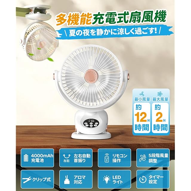 【2024年新登場オールシーズン使える多機能扇風機&USB充電式】2024年に新開発された多機能扇風機は、左右自動首振り、5段階風量調整、タイマー、LEDライト、リモコン、アロマ、LCD残量・風量段階表示、クリップ、壁掛けなどの便利な機能が付いています。クリップ扇風機は4000mAh充電池内蔵し、フル充電後、最小風量で約12H時間の連続使用可能、最大風量でも約2時間連続使用が可能です。(注:単一機能使用時。照明、首振り機能を併用すると、航続時間が短縮されます。)便利なUSB充電方式を採用しており、モバイルバッテリー、カーチャージャー、パソコンやUSB充電器などから楽々に充電できます。また、充電しながらも使用可能、暑い夏を涼しく過ごすことができます。これは真夏の熱中症対策の必需品です。(2024年5月30日追記:ご購入者様からのフィードバックと弊社テストにより、首振り機能使用時の最大風速での航続時間が約1時間であることを確認しております。)