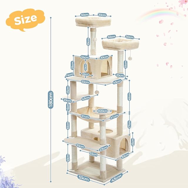 PETEPELA(ぺテぺラ) キャットタワー 大型猫用 コンパクト 多頭飼い 据え置き型 スリム ハンモック 麻紐爪とぎポール 猫のおもちゃ 転倒防止ベルト付き 展望台 猫ベッドカバー取り外し可能 運動不足解消 - 高さ180cm ベージュ