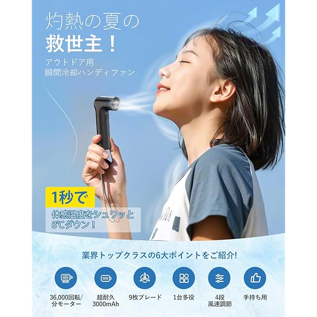 【2025年新型36000RPM超高速大風量ハンディファン】当社ハンディファンは業界トップクラスの36,000回転/分を誇る新型ブラシレスモーターを搭載。携帯扇風機従来製品比80%以上のモデルを凌駕する高速回転で、パワフルな集中風を実現。灼熱の夏日でも『瞬間冷感』を体感できる最速冷却性能を備えています。