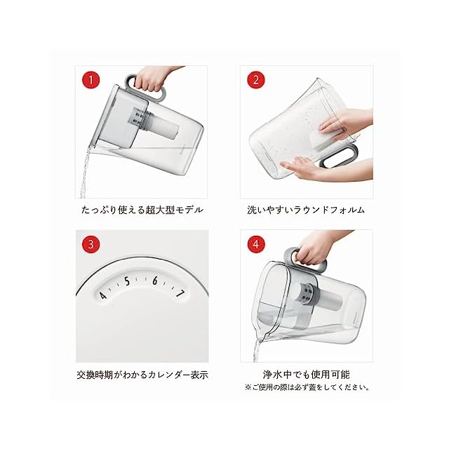 業界唯一のダブルフィルター搭載。交換時期の目安:3ヶ月(1日2L使用の場合)、ろ過水容量:2.2L(全容量:3.6L)