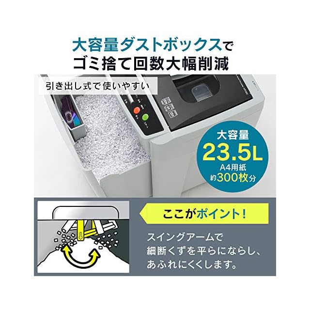 【最大細断枚数】:オート(A4コピー用紙150枚)/手差し(A4コピー用紙6枚) 【ダストボックス容量】:約23.5L(A4コピー用紙約300枚)