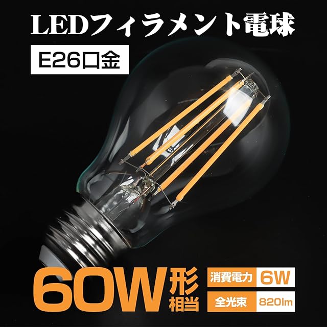 商品名:Tengyuan LED電球 エジソン電球 E26口金 フィラメント電球 60W形相当 電球色 6W 820lm 省エネ レトロ ペンダント スタンド シャンデリア ブラケットなど適用 クリアタイプ 高輝度 アップグレード 非調光 A60 360度発光 全方向タイプ 高演色性 雰囲気重視 装飾用 玄関 階段 リビング ダイニング 6個入り