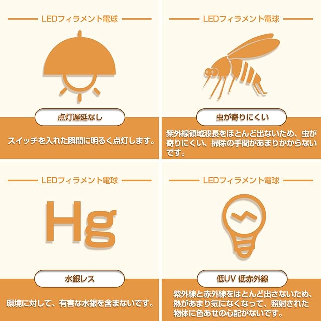 【レトロな雰囲気&全方向タイプ】見た目は過去の白熱電球と同じで、オレンジ色のフィラメントから発せられる光がレトロな美しく懐かしい色合いを演出できます。そして、360°全方向で光が隅々に照らします。白熱電球のような熱を持ちません、クラシックな形と現代のテクノロジーを融合したLED電球です。