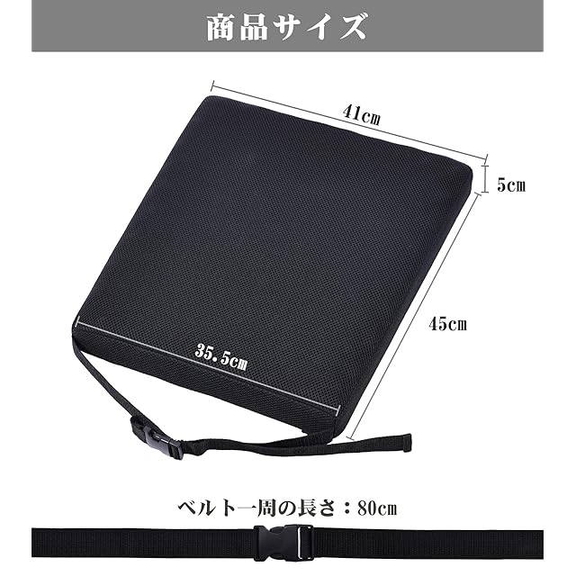 【椅子クッションのサイズ】:41*45*35.5cm 厚み5cm、ベルト全長:80cm 本体重量:約325g 5cm厚み、座る時に底付き感もなし、また耐久性優れ、長期間使っても変形しません。 発注前にご自宅のゲーミングチェアのサイズに合うかどうかをご確認ください。