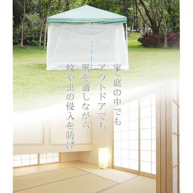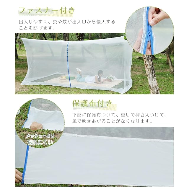 【ファスナー&保護布付き】正面にファスナー付き、出入りやすいです。開閉できて入り口から蚊が侵入することを防げます。裾に保護布がついて、重りなどでしっかりと床につけて、ゴキブリやムカデなどが入りにくく、風に吹きあがることがありません。
