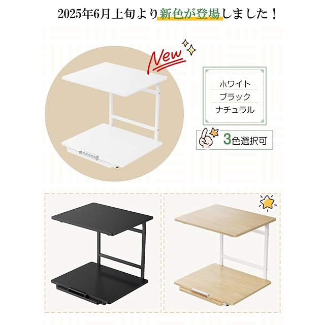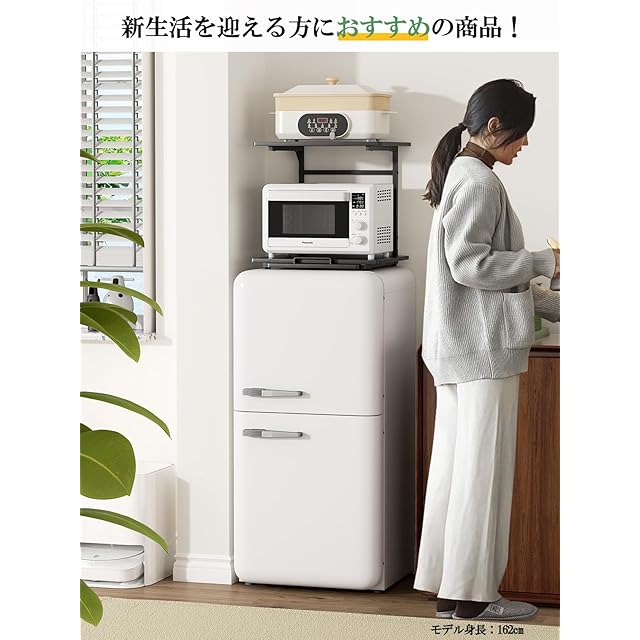 【頑丈設計・耐荷重約30Kg】2024年最新の電子レンジラックは三角ブラケットを装備しました。従来の仕様より耐荷重能力を高めます。重い調理家電も置ける頑丈仕様です。耐荷重は上棚約10Kg、下棚約20Kg、スライドトレー約2Kgです。電子レンジ、オーブントースター、コーヒーメーカーや炊飯器などのキッチン家電をひとまとめに収納できます。