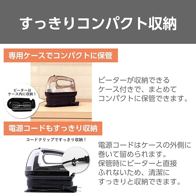 商品名:テスコム ハンドミキサー 泡立て器 立てて置ける自立式 5段階切替 【ABC Cooking Studioとの共同開発】 取り外しワンタッチ ビーター 収納付き コードクリップ付き シルバー 正規品 THM1300 S