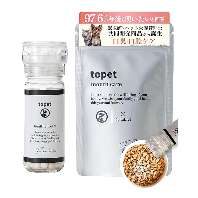 【お口のふりかけで歯垢・口臭のダブル対策】愛犬・愛猫の歯磨きが難しいと感じる飼い主様へ。topetの「お口のふりかけ」は、専用ミルでいつものごはんにふりかけるだけで、簡単にデンタルケアが可能です。歯磨き嫌いの愛犬・愛猫でも、大好きなごはんやおやつにふりかけて口腔ケア。愛犬・愛猫の歯垢・口臭ケアにオススメなデンタルふりかけです。