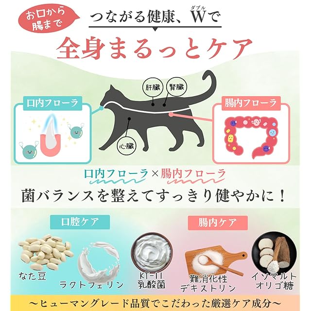【歯磨き成分をリッチに配合】人用の歯磨き粉成分としても人気な、歯磨き成分のラクトフェリンをたっぷり450mg配合。さらに口腔ケア成分として有名ななた豆や、お口の善玉菌のバランスを整える乳酸菌と、食物繊維を贅沢にプラス。ごはんやおやつにふりかけるだけで、愛犬・愛猫の歯磨き(口腔ケア・口臭ケア)ができます。