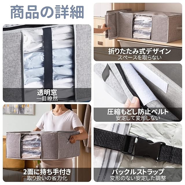 商品名:TAILI 布団圧縮袋 大型収納ボックス 衣類 収納ケース 羽毛布団 ふとん 折りたたみ式 一体型 ぬいぐるみ 季節転換 省スペース 繰り返す利用可能 スッキリ収納 掃除機対応可能 カビ ダニ対策 防塵 防湿 引越し 衣替え 整理用品 XLサイズ グレー