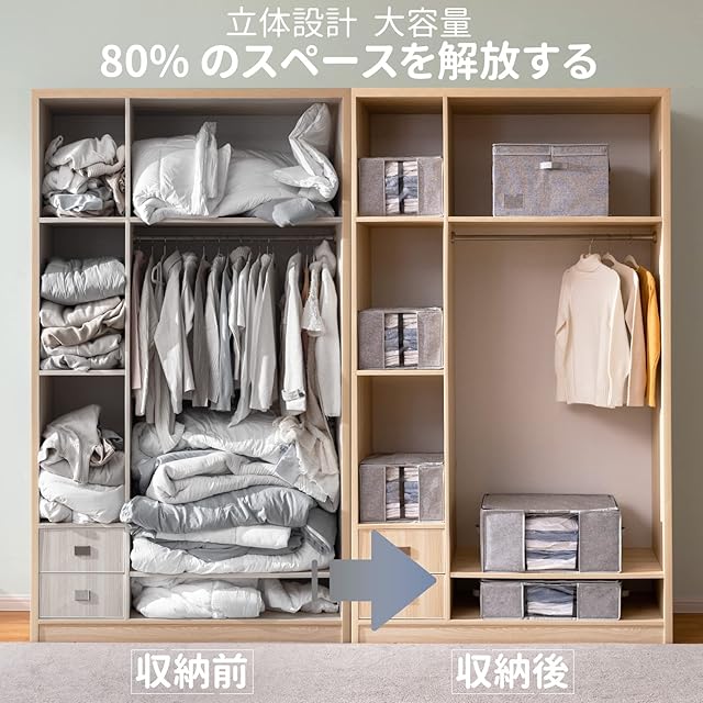 収納ボックス(1枚):65*50*27cm;圧縮袋(1枚):110*100*44cm。圧縮袋と収納ケースが一体に,容量を減らすだけでなく、クローゼットの中に美しく収納することができます。収納目安:冬用掛け布団を2~ 3枚収納できます。使用すると、クローゼットのスペースを80%増やすことができます。