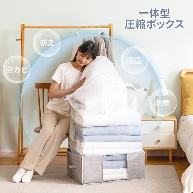 抜群な収納ボックス:収納ボックスの内部に丈夫なプレートが支えて、型が崩れにくくて、何個のボックスを積み重ねることができます。収納ボックスと圧縮袋がぴったりとフィットし、安定して変形しません。柔軟な素材で、丈夫で耐久性があります。革新的なエアバルブで、操作がより便利になります。圧縮バッグは一方向弁を採用しており、気密性があり、あらゆる掃除機に対応しています