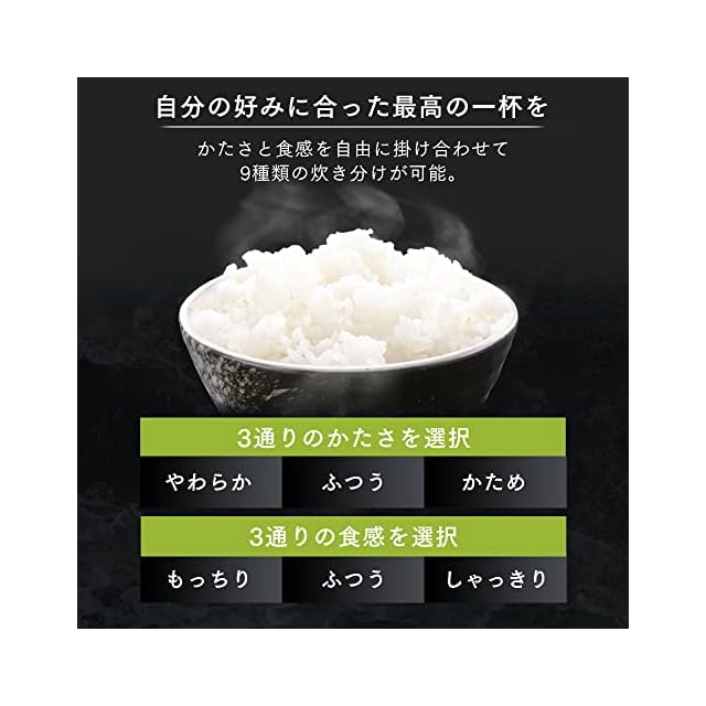 【おこのみ炊き】 かたさと食感の9通りの組み合わせで、自分好みのご飯を炊き上げる。