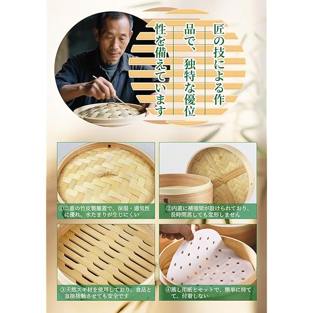 【天然素材のせいろ蒸し器】この竹と木の蒸籠、素材は大自然から!優質な竹と天然のヒノキを厳選して作っているんだ。漂白剤も、化学染料も一切使ってないから、元から有害物質が排除されてるんだ。この純粋な自然の恵みで、家族の健康な食生活をしっかり守ってくれる!毎食、ずっと安心して食べられるよっ!