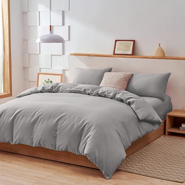 AYO 布団カバー シングル 3点セット寝具カバーセット 掛け布団カバー ボックスシーツ 枕カバー シーツ 洋式・和式兼用 ベッド用 布団用 洗い替え速乾タイプ ピーチスキン加工 防ダニ (グレー, シングル・3点セット)
