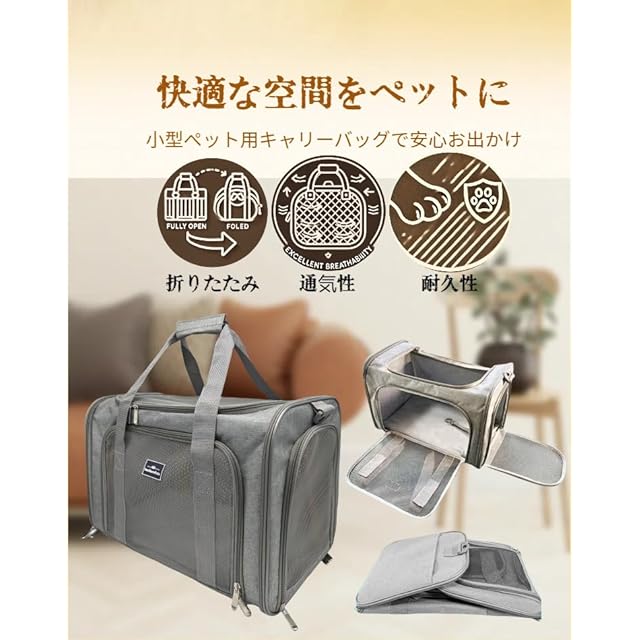 商品名:SunStarsPets ペットキャリー 猫・小型犬用 4WAY 折りたたみ式 通気&軽量 洗える底マット付き 車載・旅行対応 Mサイズ 耐荷重7kg グレー
