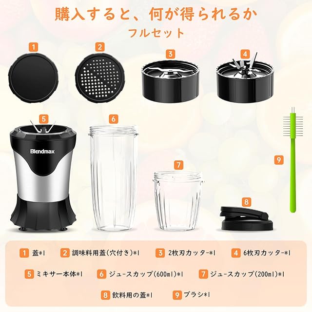 【食品グレード素材&安全設計&パッケージ内容】✅BPAフリーで無毒・無害な安全素材を使用したミキサーです。モーターは純銅製で、優れた耐久性を誇ります。✅また、高品質のABS素材を採用しており、耐寒・耐熱性能も抜群です。温度保護機能や誤作動防止の安全装置も搭載しており、安心してご利用いただけます。✅【フルセットのパッケージ内容】:モーターベース*1、600mLのジュースカップ*1、300mLのミルカップ*1、飲み口カップ*1、6枚刃カッター*1、2枚刃カッター*1、蓋*1、调味料用盖(穴付き)*1、ブラシ*1と日本語マニュアル、合わせて10点のセット付きますキッチン、アウトドア、旅行、出張、ジム、オフィスなど、さまざまな場所で簡単に使用できます。友達や家族へのプレゼント、誕生日、クリスマスギフトなどにも最適です。