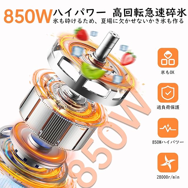 ⌛⌛⌛【850Wのハイパワー&氷も楽々粉砕】最大850Wのパワフルな性能で、食材の栄養素をしっかり抽出します。304ステンレス製の立体6枚刃とS型回転ブレードを搭載し、最大28000回/分の高速回転で、野菜や果物だけでなく、氷や冷凍野菜、穀物、コーヒー豆まで素早く細かく粉砕可能です。季節ごとの食材を活かしたスムージーが簡単に作れるので、毎日を楽しく、健康的な新しいスムージーライフを満喫できます。