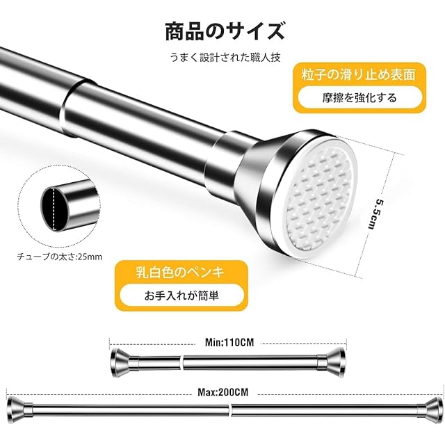 【製品設計上の理由】潮風による腐食を防ぐため、ステンレス鋼の表面にはコーティング加工を施しています。統一された明るいシルバーを採用し、より美しく、高級 。 製品の防水性能と防錆性能を向上させます。 つっぱり棒シルバー付属18個の無料カーテンリング。使用中により良い選択肢をお客様に提供します。シャワーカーテンロッド、収納ロッド、ワードローブ、洋服ロッドとして使用できま。