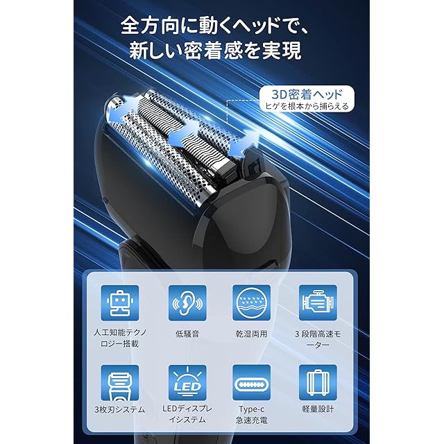 商品名:2025【新バージョン】ひげそり シェーバー 電動 メンズ 往復式 電気シェーバー 深剃り 髭剃り 3枚刃 usb充電式 LEDディスプレ 乾湿両用 電動シェーバー 低騒音 ヒゲトリマー 軽量 コンパクト 高耐久 電気カミソリ 水洗い IPX7防水 携帯髭剃り お風呂 持ち運び便利 男性 父の日 旅行 出張 プレゼント ギフト 取扱説明書付き