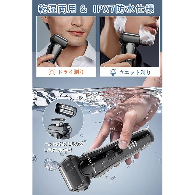 【乾湿両用設計&IPX7防水仕様】 電気髭剃り が乾湿両用設計で、メンズ シェーバーの防水レベルはIPX7です。直接乾燥した状態でシェービングすることもできるし、顔にゲルや泡を塗った湿潤状態で剃ることもでき、乾湿両用で、異なるシェービング要求を満たすことができます, 風呂剃り対応なので、ドライシェービングが苦手な皮膚の弱い人でも快適に使用できる可能性があります。きれいにする時は、まずブラシできれいにしてから、ヘッド部分を水で洗って、もっときれいにすることができます。