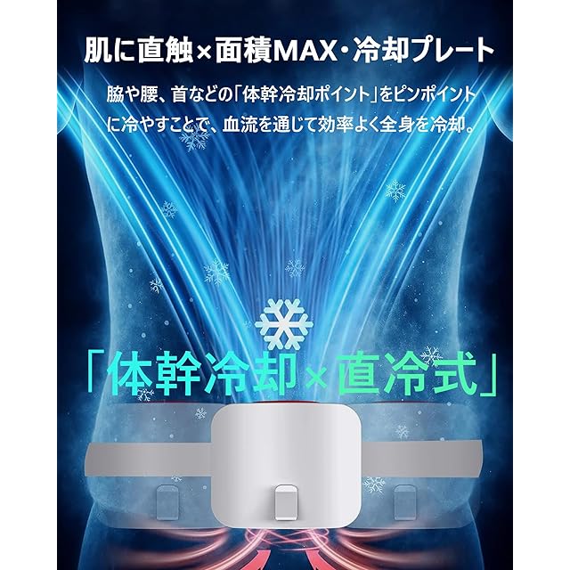 【冷却面積No.1クラス|腰全体を一気に冷却】 従来品と比較して冷却プレートの接触面積が大幅拡大。広範囲にわたって冷気が広がり、熱がこもりやすい腰回りを効率よく冷却。汗の発生を抑え、熱中症対策に抜群の効果を発揮します。