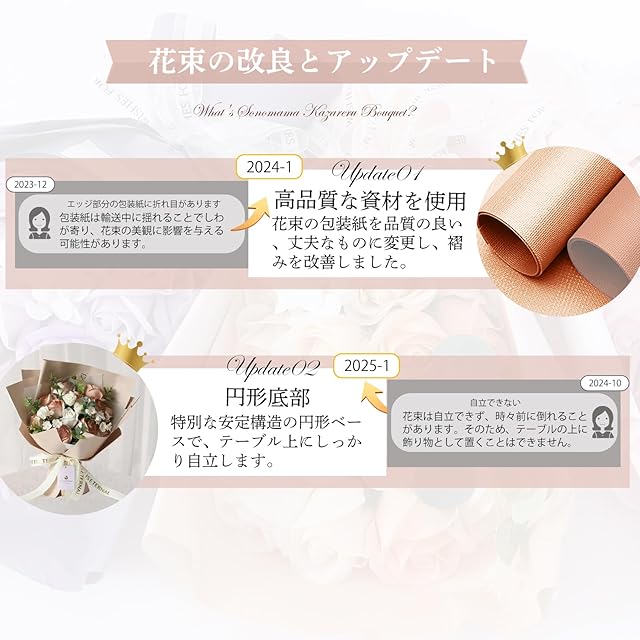 ② ソープフラワーが選ばれる理由:1.手入れ不要で枯れない!長く美しさを楽しめます。2.プリザーブドフラワーよりボリュームたっぷり。3.鮮やかな色彩と優しい石鹸の香りで癒されます。4.花粉がないため、アレルギーの心配が不要。5.見た目も香りも楽しめる理想のフラワーギフト。