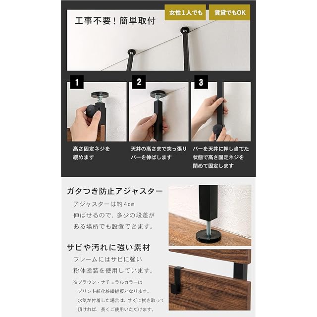 【DIYや工事による穴あけ不要! 】賃貸でも安心な天井と床を使った突っ張り式なので、デッドスペースの有効活用が女性一人でも簡単にできます。