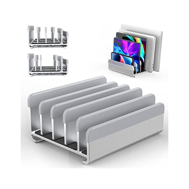 【最新版&5in1を実現】PC/タブレットPCを4台同時ストレージが可能に!それ以外、サイドにはスマホを収納できます。 当社のノートPCオーガナイザーは、3つのスライド式スタンドがあり、厚さの異なるノートPCを最大4台まで収納できるよう調整できます。 複数のノートPCを収納するのに最適なノートPC収納スタンドです。