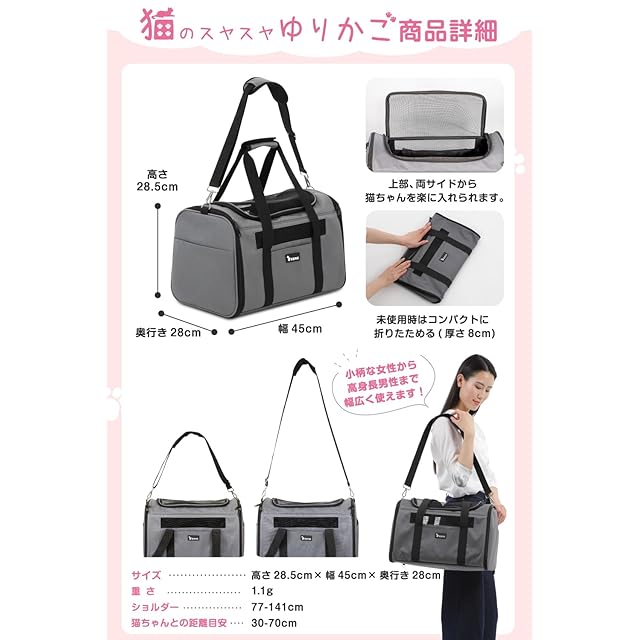 ✅【猫ちゃんとの距離が近く、安心させられる】ショルダーベルトの長さは約77cm~144cmまで自由に変えられます。最も短くすると、飼い主様のお顔と猫ちゃんまでの距離が30cmほどになります。移動中は時折猫ちゃんに声をかけて、普段と違う状況で不安そうな猫ちゃんを安心させてあげて下さい。