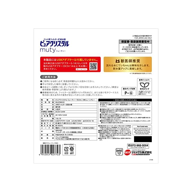 ●本体サイズ:約幅20.7×奥行22.5×高さ13.5cm●電源コード長:約1.9m(中間接続部含む)※本体からの長さ●最大水容量:約950mL●適合ポンプ型番:P-6●定格電圧/消費電力:DC5V 0.4W●アダプター使用時の消費電力:AC100V 0.6W●流量:1.6L/分●使用アダプター(別売):USBアダプターG-1A 入力:AC100V 出力:DC5V 1A ※本製品にはUSBアダプターは付属していません!当社純正アダプター(USBアダプター G-1A)もしくは市販のUSBアダプター(DC5V 1A以上)をお買い求めください。