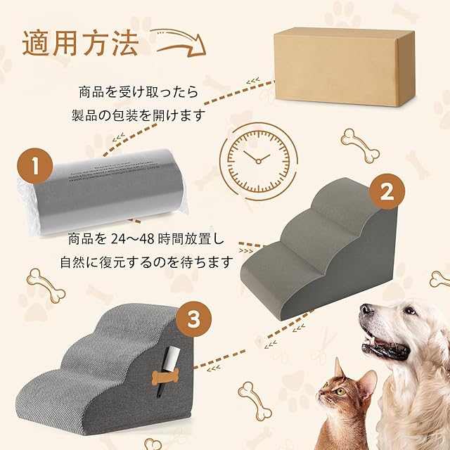 【ヘルニア防止】こちらのペット用ステップの中身は高品質のスポンジを使っていて、クッション性もリバンド性もよく、衝撃を減らせる上に凹むことはありません。ペットステップを使えば、ペットがソファーやベットから飛び降りる衝撃を軽減することができ、足腰の負担を減らし、ヘルニアの防止になれます。